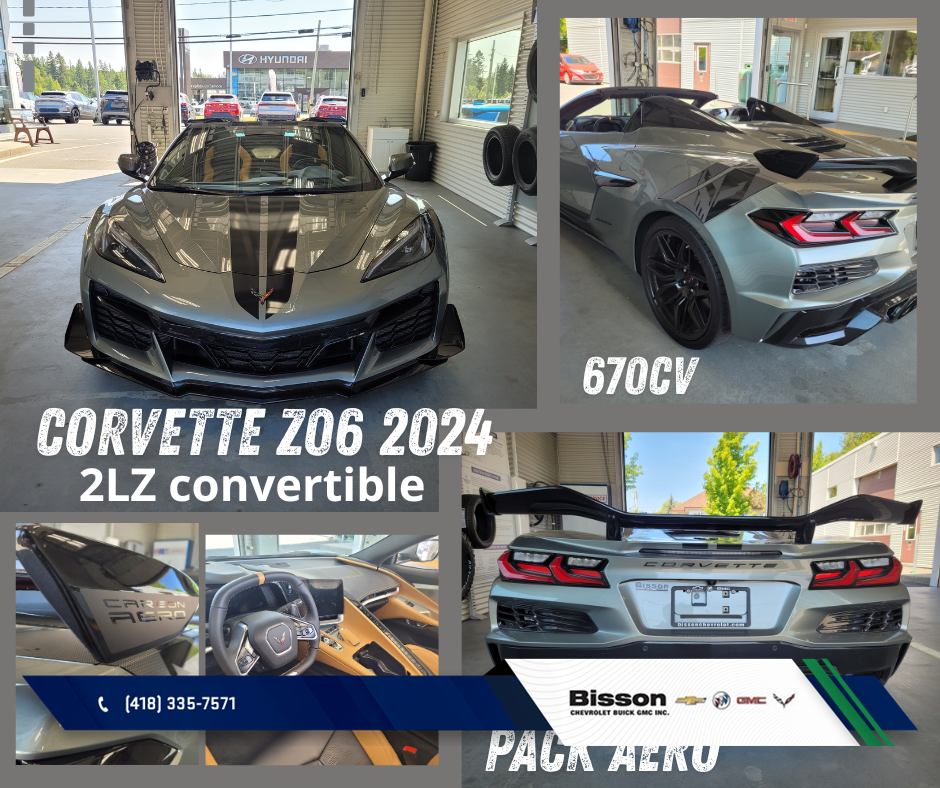 This 2024 Chevrolet Corvette is available at Bisson Chevrolet Buick GMC in Thetford Mines. Contact our sales team or come meet us at 2257 Rue Notre Dame E for more details, for a test drive, or to make a reservation.
